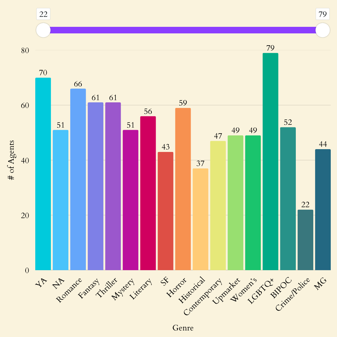 Nine categories have the majority interest among agents with open queries. The market is robust. YA, Romance, Fantasy, Thriller, Literary, BIPOC representation, Mystery, NA—all over 50%.
